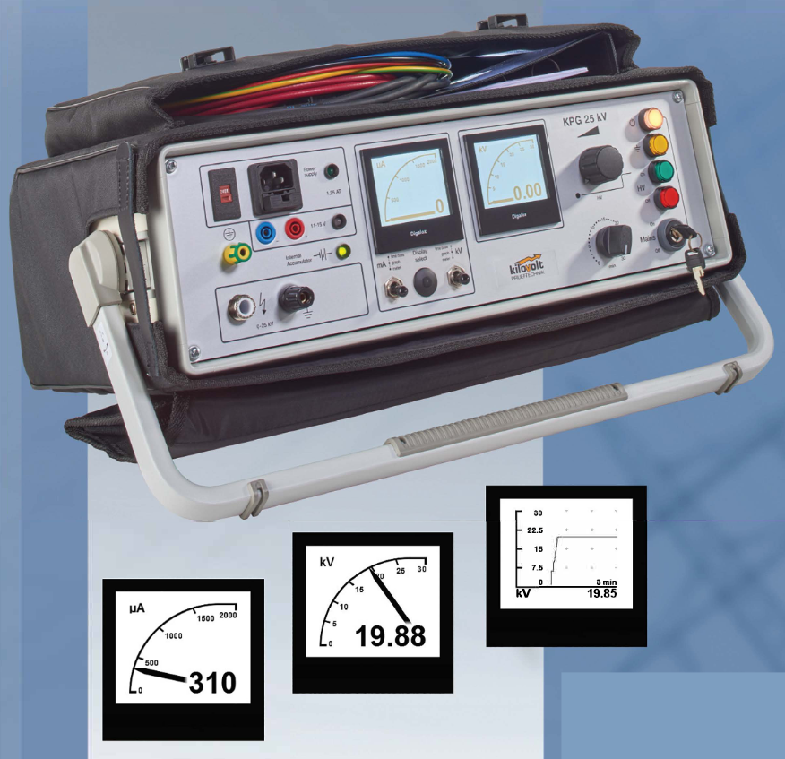 KPG 25kV е универсалено устройство за изпитване с високо напрежение (ВН) до 25кВ. Уредът съчетава изключителна здравина с ниско тегло и компактен дизайн, което го прави лесно преносим и много удобен за работа. Вградената акумулаторна батерия на KPG 25kV дава възможност за провеждане на автономни тесове. В случай на грешка или в края на тест на капацитивен товар, такъв като екраниран силов кабел, последният ще бъде разреден правилно автоматично, от вградено разрядно устройство в тестера. Секретен ключ, бутон за включване с блокировка и защитна заземителна верига осигуряват максимална защита за обслужващия персонал и оборудването.